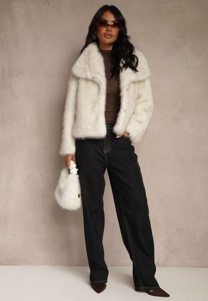 Beżowa Kurtka Futrzana Ozdobiona Kołnierzem Avelire
