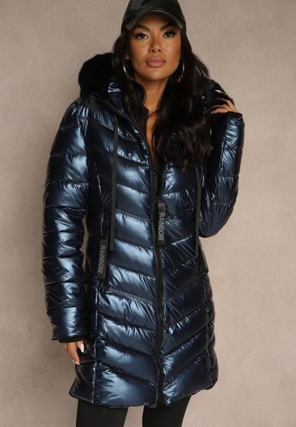 Granatowa Taliowana Kurtka z Pikowanymi Przeszyciami i Kapturem z Futrem Nalidea