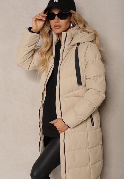 Beżowa Kurtka z Kapturem i Pikowanymi Przeszyciami Zdobiona Szerokimi Taśmami Etterisa