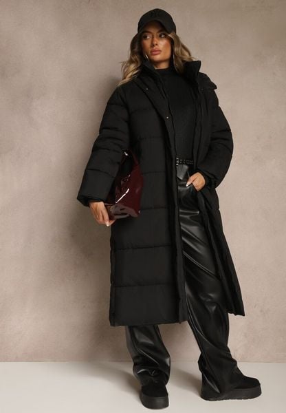 Czarna Zimowa Kurtka Pikowana o Długim Kroju z Odpinanym Kapturem i Futrem Torika