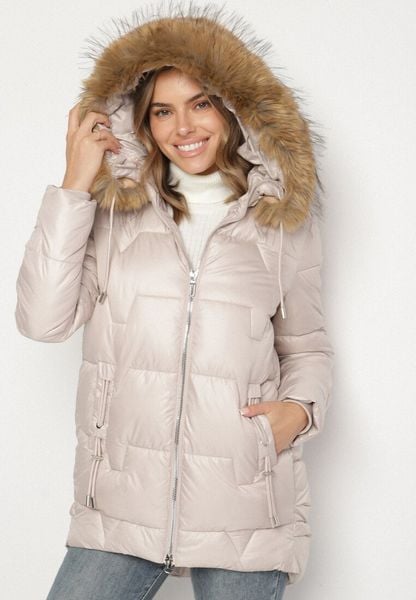 Beżowa Pikowana Kurtka z Kapturem z Odpinanym Futerkiem Galiara