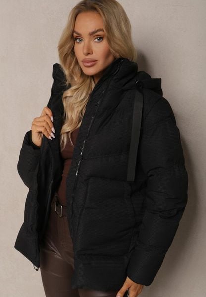 Czarna Kurtka Oversize z Pikowanymi Przeszyciami Kieszeniami i Ściągaczem Zinnaria