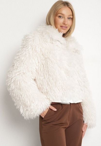 Biała Krótka Kurtka Futerko z Wysokim Kołnierzem i Długim Włosiem Lanalia