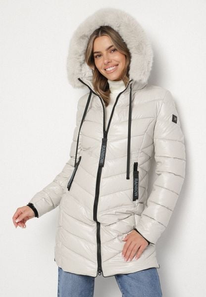 Biała Pikowana Kurtka o Taliowanym Kroju z Kapturem z Futerkiem Naleanna