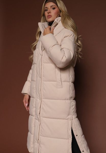 Jasnobeżowa Zimowa Kurtka z Pikowanymi Przeszyciami Kapturem i Bocznymi Napami Alarisse