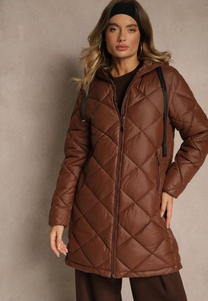 Brązowa Pikowana Kurtka o Długim Kroju z Kapturem Olendia