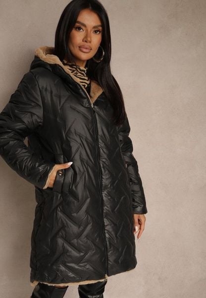 Czarna Dwustronna Kurtka o Kroju Parki z Kapturem i Futrzaną Podszewką z Pikowaniem Hetinia