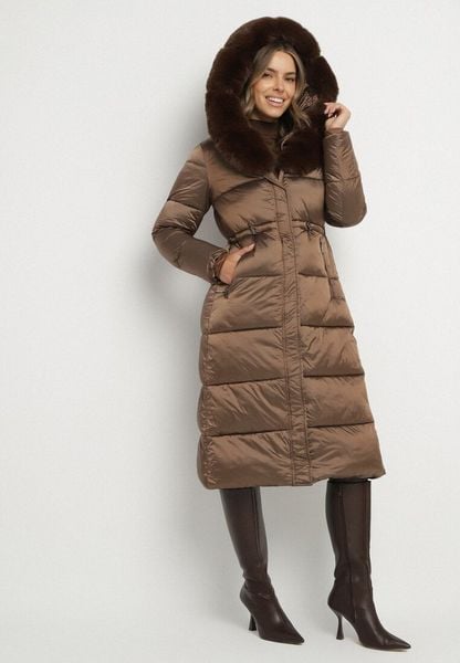 Brązowa Długa Kurtka Puchowa z Pikowanymi Przeszyciami i Kapturem z Futrem Zevea