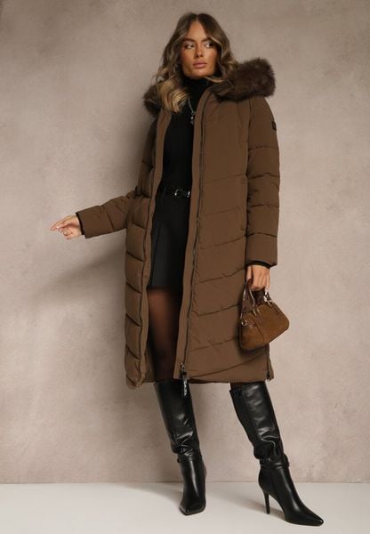 Jasnobrązowa Pikowana Kurtka o Długim Kroju z Kapturem z Futrem z Możliwością Odpięcia Tiennara