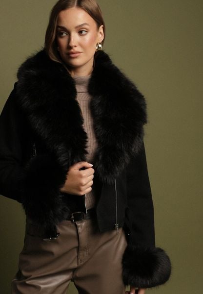Czarna Ocieplana Kurtka Ramoneska z Futrem przy Kołnierzu i Rękawach Mevesala