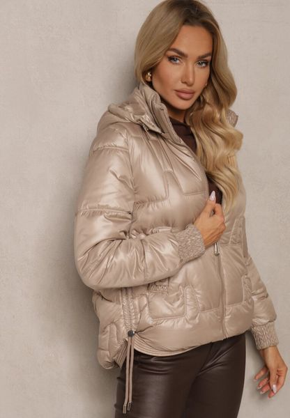 Ciemnobeżowa Pikowana Kurtka z Odpinanym Kapturem Wydłużonym Tyłem i Ściągaczami Zinonia
