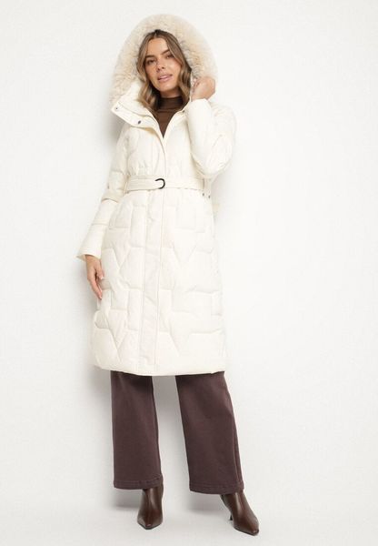 Biała Długa Pikowana Kurtka z Kapturem Odpinanym Futerkiem i Paskiem w Talii Serenira