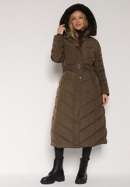 Ciemnozielona Długa Kurtka Zimowa z Pikowaniem Paskiem i Kapturem z Futrem Retilma