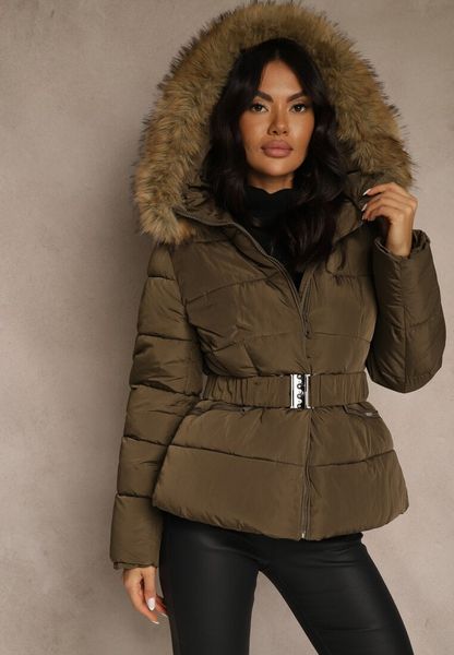 Ciemnozielona Kurtka Pikowana z Nieodpinanym Kapturem Futerkiem i Paskiem Retelda