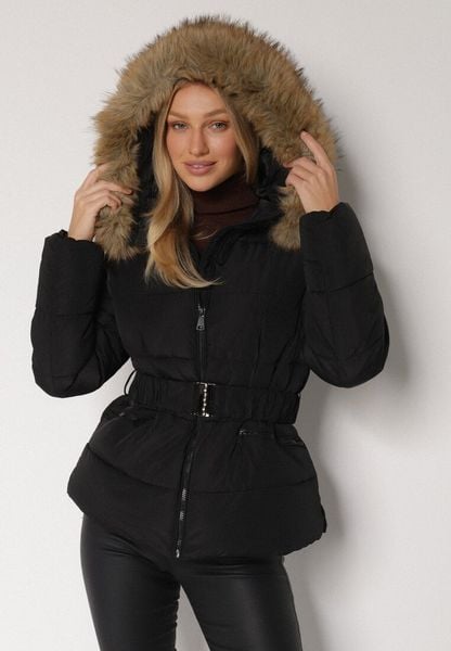Czarna Pikowana Kurtka z Paskiem Nieodpinanym Kapturem i Futerkiem Retinda