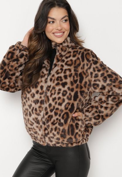 Brązowa Futerkowa Kurtka ze Ściągaczami i Stójką w Cętki Viazelle