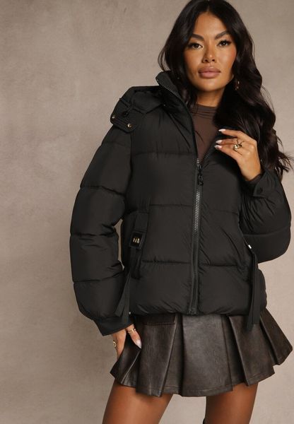 Czarna Kurtka Puffer z Pikowanymi Przeszyciami i Odpinanym Kapturem Gallerea