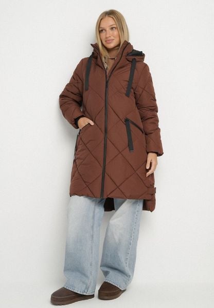 Brązowa Kurtka z Pikowanymi Przeszyciami i Kapturem Zdobiona Sznurkami Evivienne