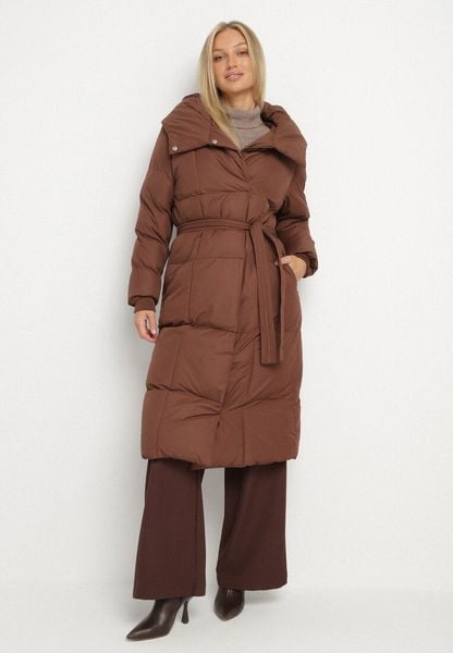 Brązowa Długa Kurtka Pikowana z Kapturem i Wysokim Kołnierzem Wiązana w Talii Zevrira