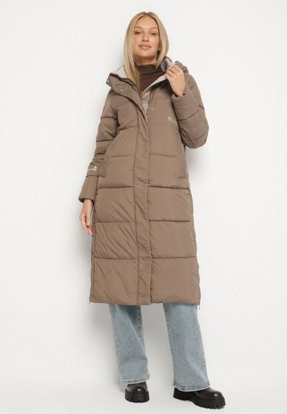 Brązowa Długa Kurtka Pikowana z Kapturem i Bocznymi Suwakami Aruvitta