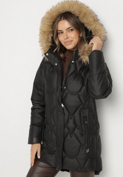 Czarna Pikowana Kurtka z Kapturem z Futerkiem Oliresa