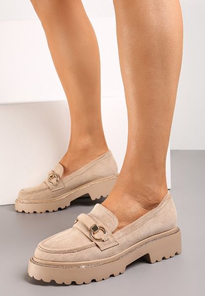 Beżowe Mokasyny z Ekozamszu z Cyrkoniami Wokół Podeszwy i Dekoracyjną Klamrą Corvina