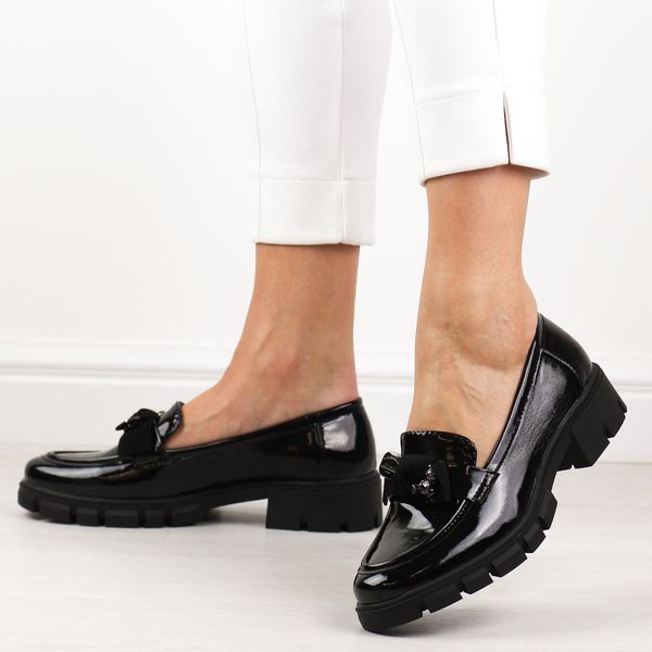 Czarne lakierowane mokasyny damskie z misiem M.Daszyński 23106-1