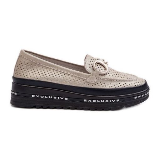 Złote Lekko Błyszczące Półbuty Mokasyny na Platformie z Perforacją i Klamrą Alerin
