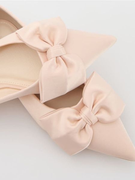 Buty typu baleriny wykonane z gładkiej tkaniny.