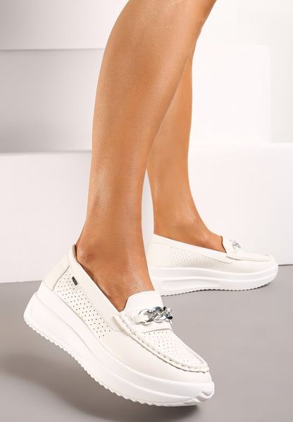 Białe Mokasyny na Platformie Wykończone Perforacją i Łańcuszkiem Tessamarie