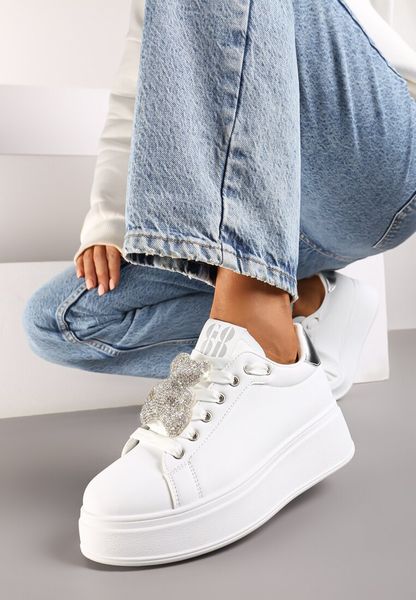 Biało-Srebrne Sneakersy z Odpinaną Ozdobną na Sznurowaniu i Cyrkoniami na Języku Vanello