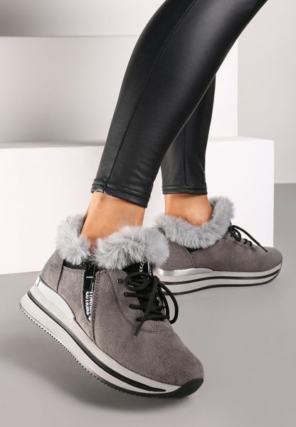 Szare Sneakersy na Płaskiej Podeszwie z Napisem i Futerkiem Taricea