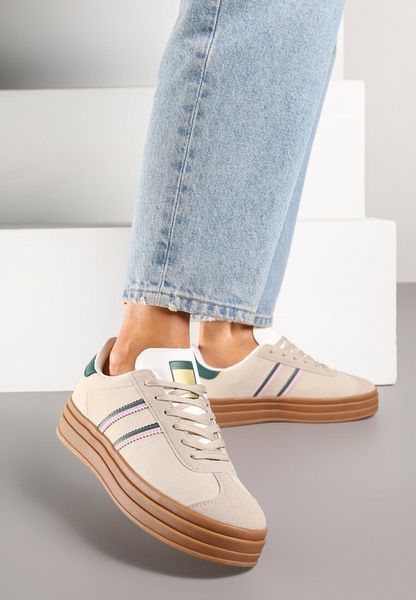 Beżowo-Zielone Sneakersy na Platformie z Minimalistycznymi Przeszyciami Teritha