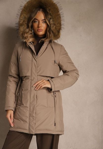 Ciemnobeżowa Klasyczna Kurtka Parka z Kapturem z Futrem Nalisava