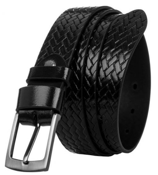 Atrakcyjny pasek męski odszyty z wysokogatunkowej skóry naturalnej licowej. Jego powierzchnię zdobi tłoczony wzór imitujący plecionkę. Pasek zakończony masywną, prostokątną klamrą w srebrnym kolorze. Możliwość samodzielnego skrócenia paska.