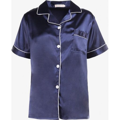 Komplet Piżamowy Ismaea wykonany z połyskującej satyny. Składa się z koszuli i szortów. Koszula zapinana na guziki, zakończona kołnierzykiem. Na wysokości klatki piersiowej naszyta kieszeń. Krótkie, luźne szorty z gumką w pasie. Koszula i szorty gładkie, zdobione cienką lamówką. Elegancka piżama, idealna na lato. Rozmiarówka zaniżona – zalecamy wybór rozmiaru o 1 większy.