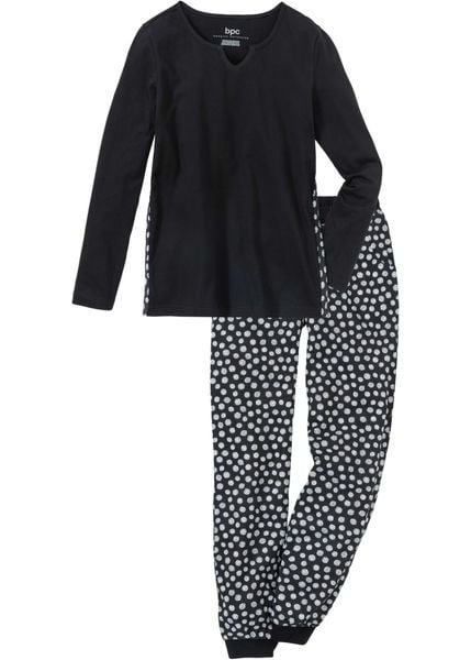Wygodna piżama z praktycznymi kieszeniami w spodniach. Wygodna piżama z modnym nadrukiem w kropki przekonuje praktycznymi kieszeniami w spodniach i wygodnymi ściągaczami u dołu nogawek. Nadruk w kropki na spodniach powtarza się na dekolcie i bocznych szwach koszulki.