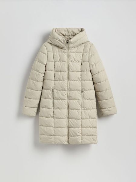 Płaszcz o dłuższym kroju, wykonany z gładkiej, pikowanej tkaniny.