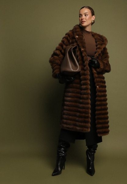 Brązowy Futrzany Płaszcz w Pikowany Wzór z Kapturem Esarra