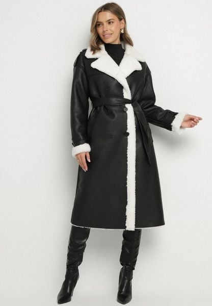 Czarny Dwurzędowy Płaszcz z Imitacji Skóry z Wiązanym Paskiem i Futrem Guritte