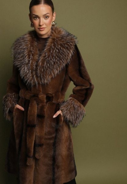 Brązowy Futrzany Płaszcz z Paskiem i Ozdobnym Kołnierzem i Rękawami Ceneffa