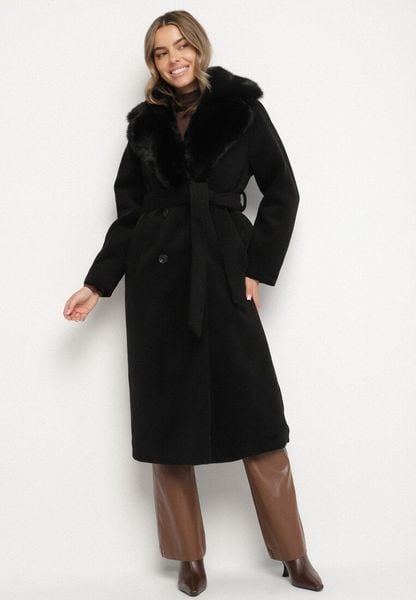 Czarny Elegancki Płaszcz Dwurzędowy z Futrem i Wiązanym Paskiem Azonlle