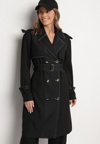 Czarny Płaszcz Trencz z Bawełną Ozdobiony Jeansowymi Wstawkami Tirsedi