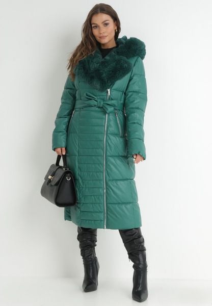 Zielona Kurtka Długa Pikowana Płaszcz z Imitacji Skóry z Futerkiem Sezee
