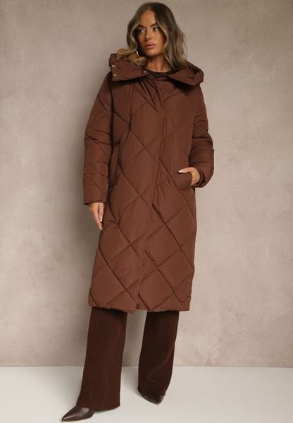 Brązowa Zimowa Kurtka za Kolano Płaszcz z Szerokim Pikowaniem i Nieodpinanym Kapturem Hressa