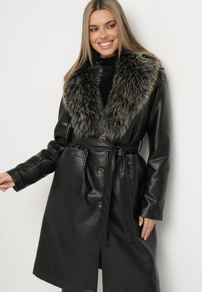 Czarny Jednorzędowy Płaszcz z Imitacji Skóry z Wiązanym Paskiem i Odpinanym Futrem Semivora