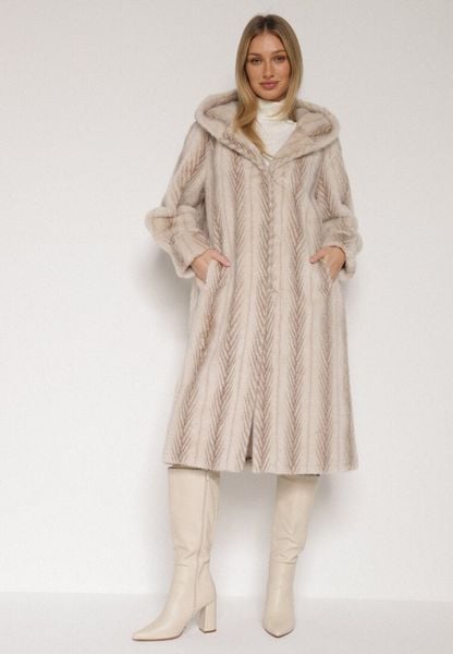 Jasnobeżowy Płaszcz Futerko w Pionowy Wzór z Kapturem Cahroris