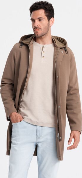 Kurtka męska Ombre Płaszcz męski z kapturem w delikatny prążek – kawowy V1 OM-COSC-0112 L