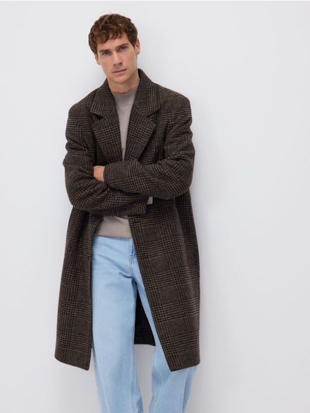 Płaszcz o prostym kroju, wykonany z tkaniny z domieszką wełny.
