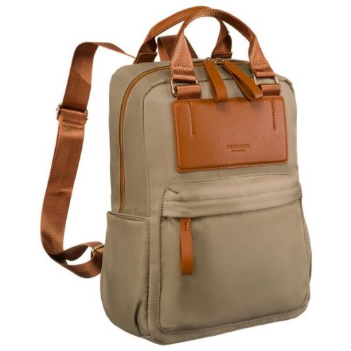 Plecak odszyty z nylonu i ekoskóry kolorach khaki i brązowym. Wyposażony w regulowane, szerokie szelki i podwójny uchwyt dla różnych stylów noszenia. Plecak zamykany suwakiem. Posiada pas bagażowy z tyłu.